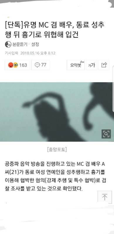 "Public TV music show MC and actor A (21 years old) has been sexually harassing his coworker, a female celebrity, and threatened her with a lethal weapon. He is under police investigations"