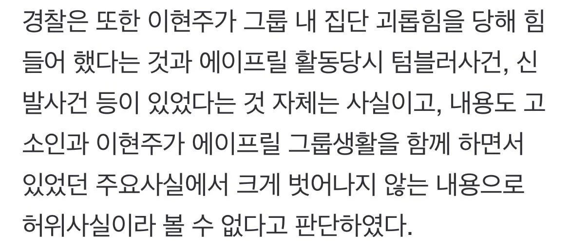 "The police also said that it is true that Lee Hyunjoo had a hard time due to bullying within the group, and that the tumbler and shoe incidents happened during April's promotions. It was decided that the content could not be regarded as false."